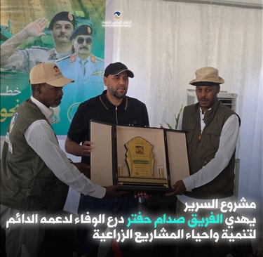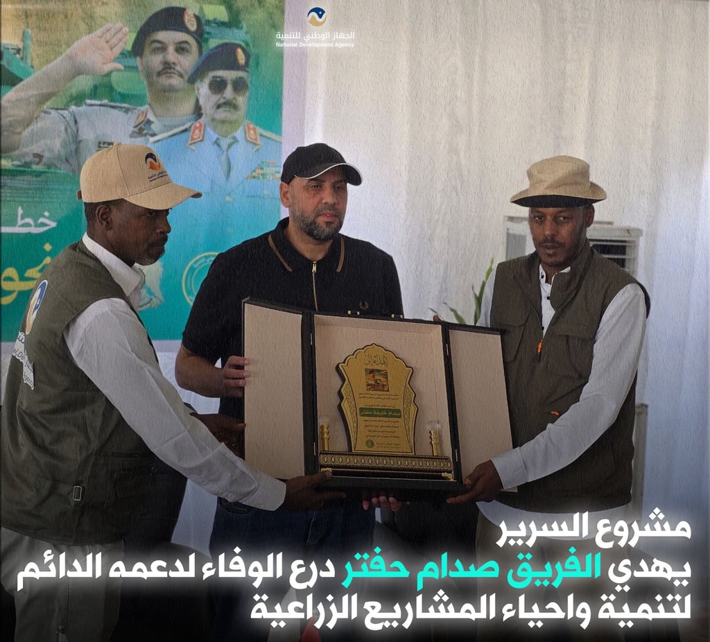 في خطوة رمزية، قدّم موظفو المشروع درع الوفاء إلى الفريق صدام حفتر، تقديرًا لدعمه المستمر وجهوده في تطوير وتنمية المشاريع الزراعية. يأتي هذا التكريم ليعكس أهمية العمل الجماعي في تحقيق الاكتفاء الذاتي وتعزيز الأمن الغذائي الوطني.
